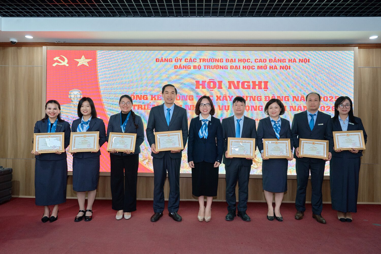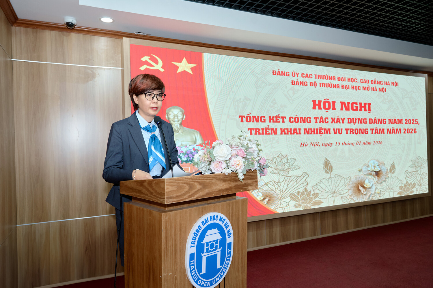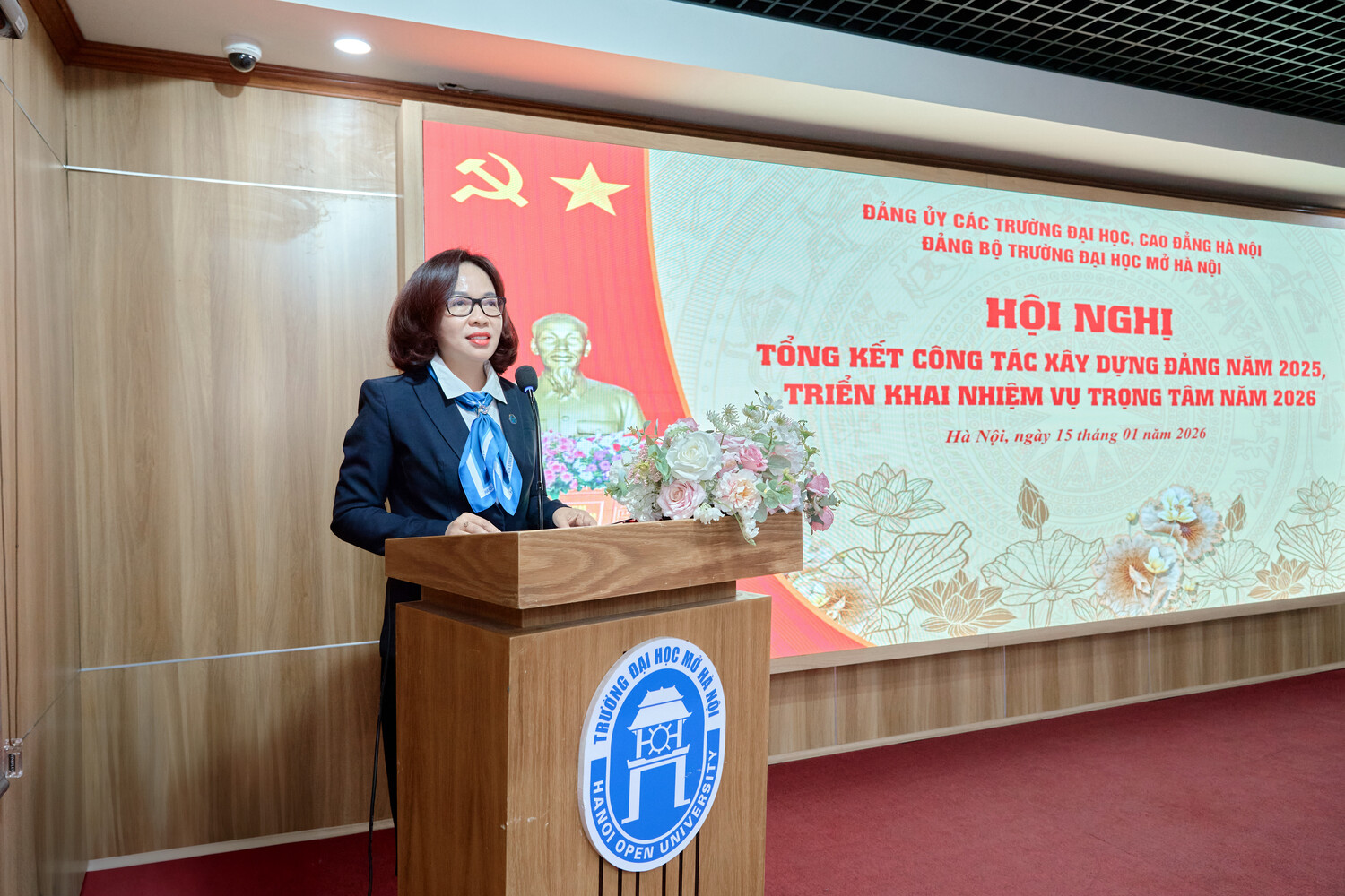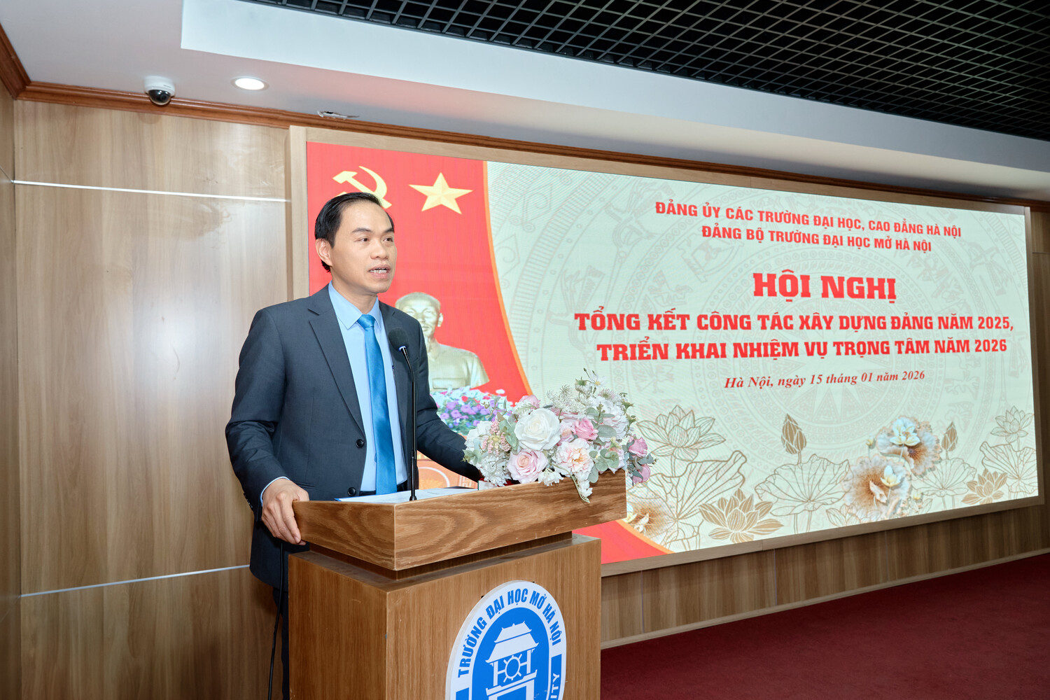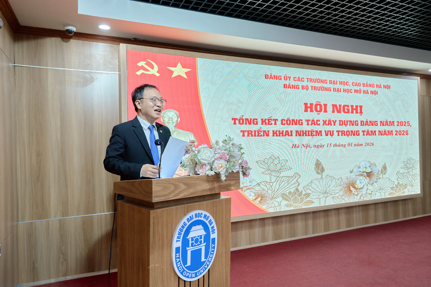 Sáng ngày 15/01/2025, Đảng bộ Trường Đại học Mở Hà Nội tổ chức Hội nghị Tổng kết công tác xây dựng Đảng năm 2025, triển khai nhiệm vụ trọng tâm năm 2026. Hội nghị được tổ chức trực tiếp tại Hội trường A2 và kết nối trực tuyến tới các điểm cầu trong toàn Đảng bộ, thể hiện tinh thần đổi mới phương thức lãnh đạo, ứng dụng công nghệ thông tin trong sinh hoạt Đảng, đồng thời tạo điều kiện để đông đảo cán bộ, đảng viên tham gia đầy đủ, nghiêm túc.
