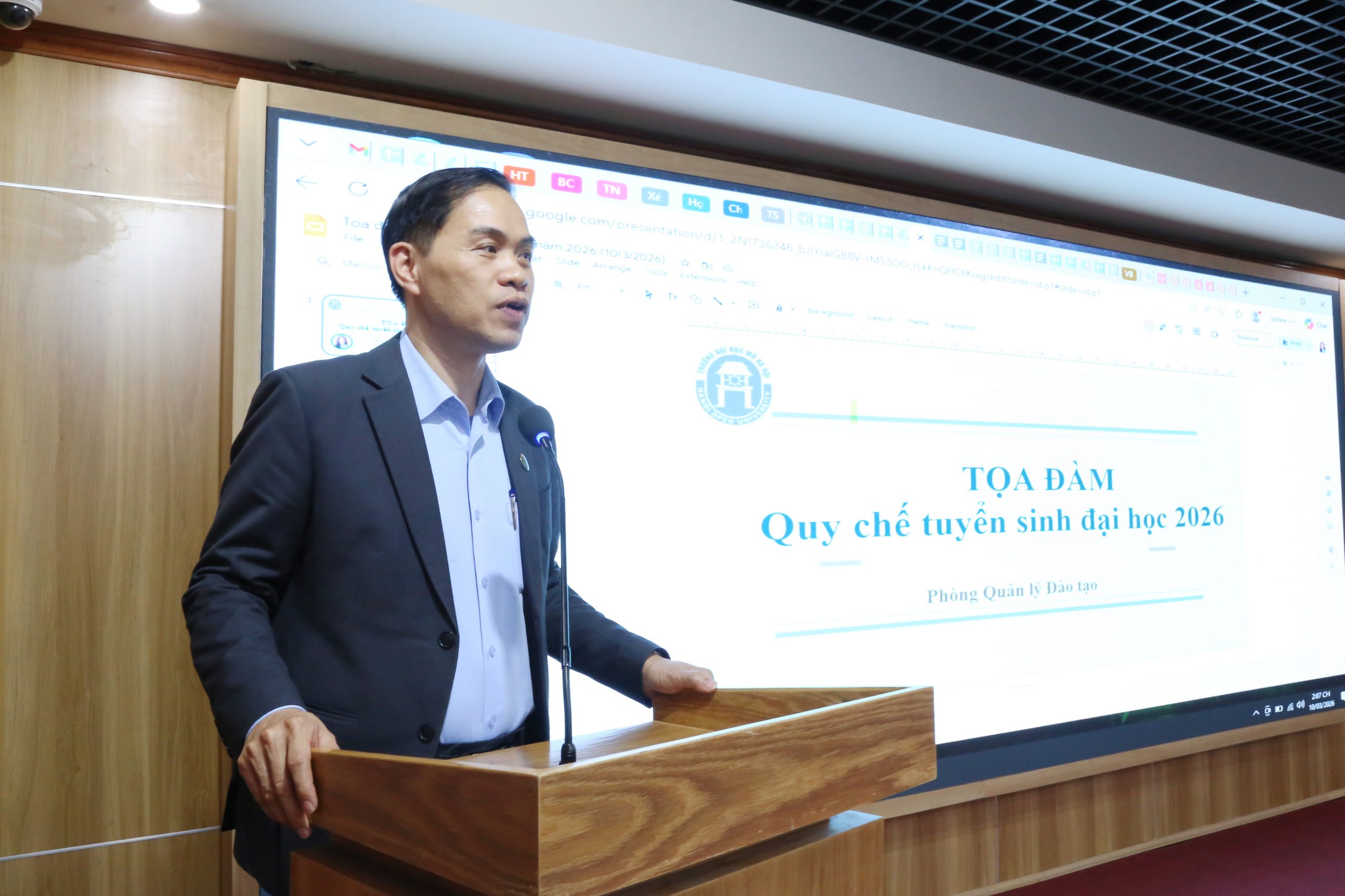 Ngày 10/3/2026, Trường Đại học Mở Hà Nội tổ chức Tọa đàm về Dự thảo Quy chế tuyển sinh trình độ đại học năm 2026 nhằm trao đổi, cập nhật và triển khai các quy định mới theo Thông tư số 06/2026/TT-BGDĐT ngày 15/02/2026 của Bộ Giáo dục và Đào tạo ban hành Quy chế tuyển sinh trình độ đại học và tuyển sinh trình độ cao đẳng ngành Giáo dục Mầm non. Buổi tọa đàm có sự tham dự của lãnh đạo nhà trường, trưởng (phụ trách) các đơn vị trong nhà trường.