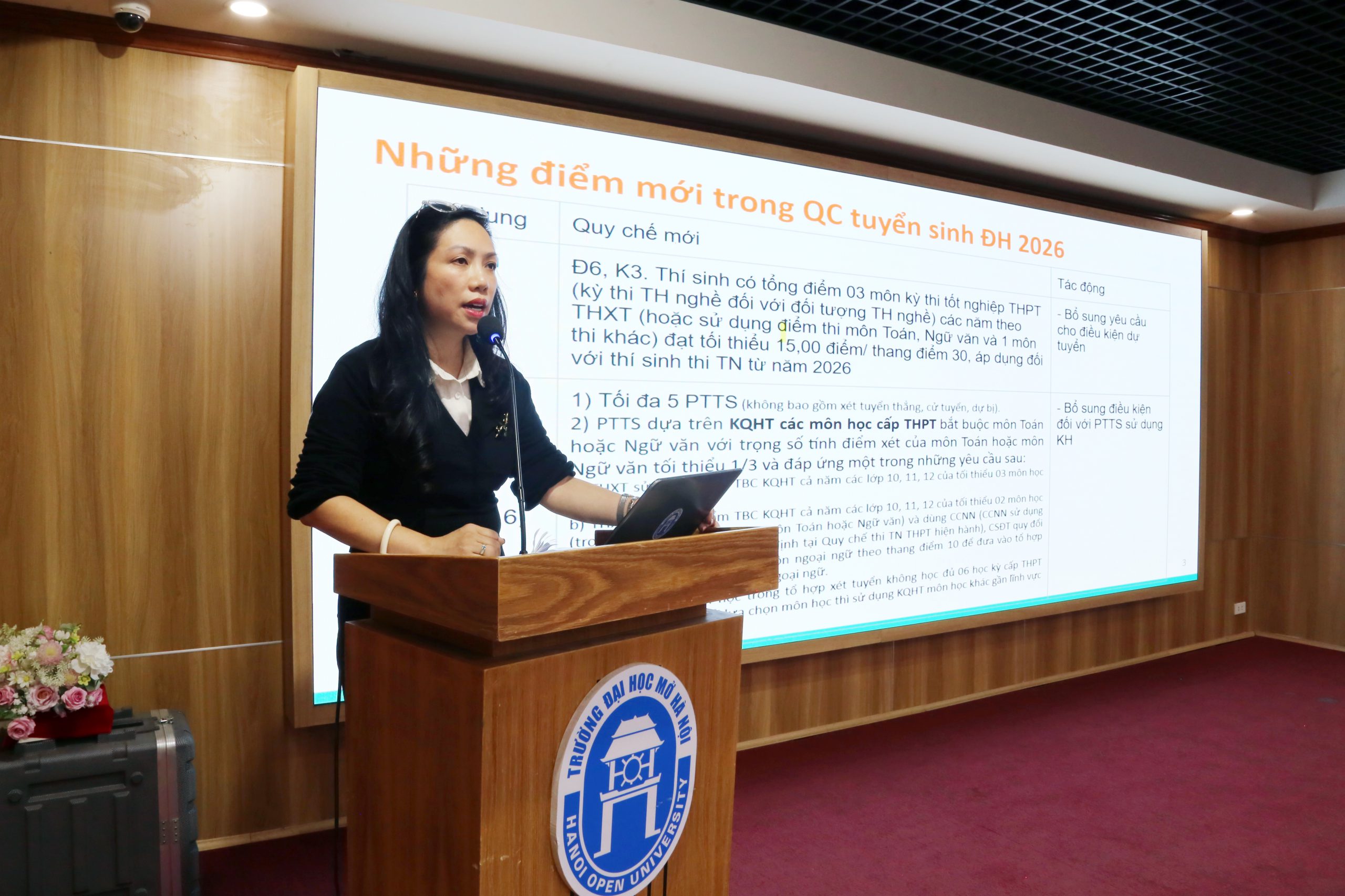 TS. Trần Thị Lan Thu – Trưởng phòng Quản lý Đào tạo đã trình bày Dự thảo Quy chế tuyển sinh các ngành đào tạo trình độ đại học của Trường Đại học Mở Hà Nội năm 2026, đồng thời phân tích chi tiết các điểm mới trong quy định của Bộ GD&ĐT theo Thông tư 06/2026/TT-BGDĐT.