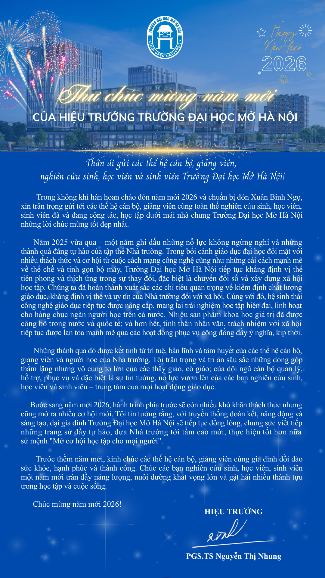 Trong không khí của một mùa xuân mới, trân trọng gửi tới các thế hệ cán bộ, giảng viên, nghiên cứu sinh, học viên và sinh viên toàn văn Thư chúc mừng năm mới 2026 của PGS TS Nguyễn Thị Nhung – Hiệu trưởng Trường Đại học Mở Hà Nội.