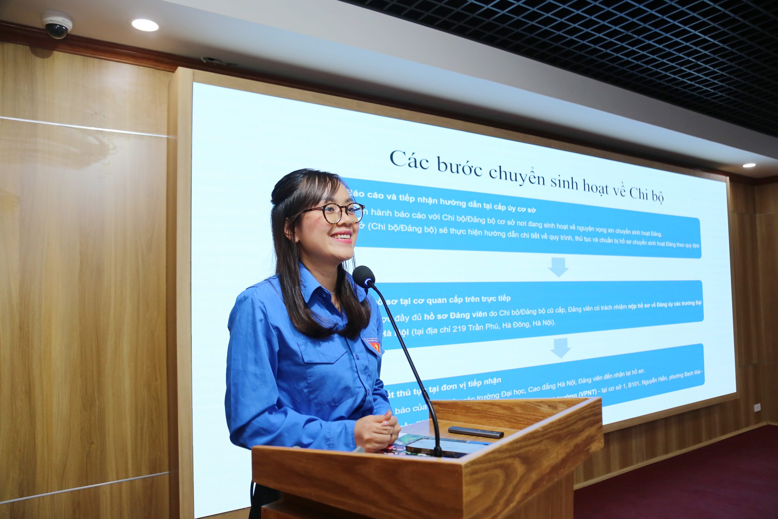 Đồng chí Nguyễn Thùy Linh – Bí thư Chi bộ Sinh viên 2 chia sẻ chuyên đề “Quy trình chuyển sinh hoạt Đảng về Đảng ủy Trường Đại học Mở Hà Nội”, giúp tân sinh viên nắm rõ quy định để đảm bảo công tác sinh hoạt được thực hiện đúng, đủ và hiệu quả.