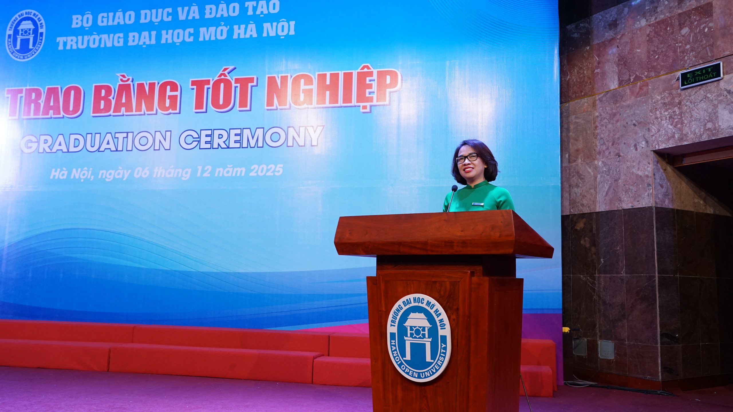 Tân cử nhân Phạm Thị Bích – Ngành Ngôn ngữ Anh, thay mặt toàn thể sinh viên tốt nghiệp, chia sẻ những cảm xúc chân thành và gửi lời tri ân tới gia đình, thầy cô và bạn bè – những người đã luôn đồng hành, động viên trong suốt hành trình học tập. “Ngày hôm nay là thành quả của sự cố gắng không chỉ của riêng em, mà của tất cả những ai đã tin tưởng và ủng hộ em. Đại học Mở Hà Nội không chỉ cho chúng em kiến thức, mà còn trao cơ hội để trưởng thành và khám phá bản thân”, tân cử nhân Phạm Thị Bích bày tỏ.