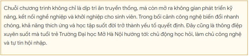 Sự kiện kết hợp giữa giáo dục truyền thống với định hướng phát triển kỹ năng, nghề nghiệp cho sinh viên trong bối cảnh chuyển đổi số và hội nhập quốc tế. Phát biểu tại chương trình, PGS.TS Dương Thăng Long – Bí thư Đảng ủy, Phó Hiệu trưởng Trường Đại học Mở Hà Nội nhấn mạnh, tổ chức Đoàn giữ vai trò quan trọng trong giáo dục lý tưởng, đạo đức, lối sống, đồng thời là môi trường rèn luyện kỹ năng, giúp sinh viên phát triển toàn diện.