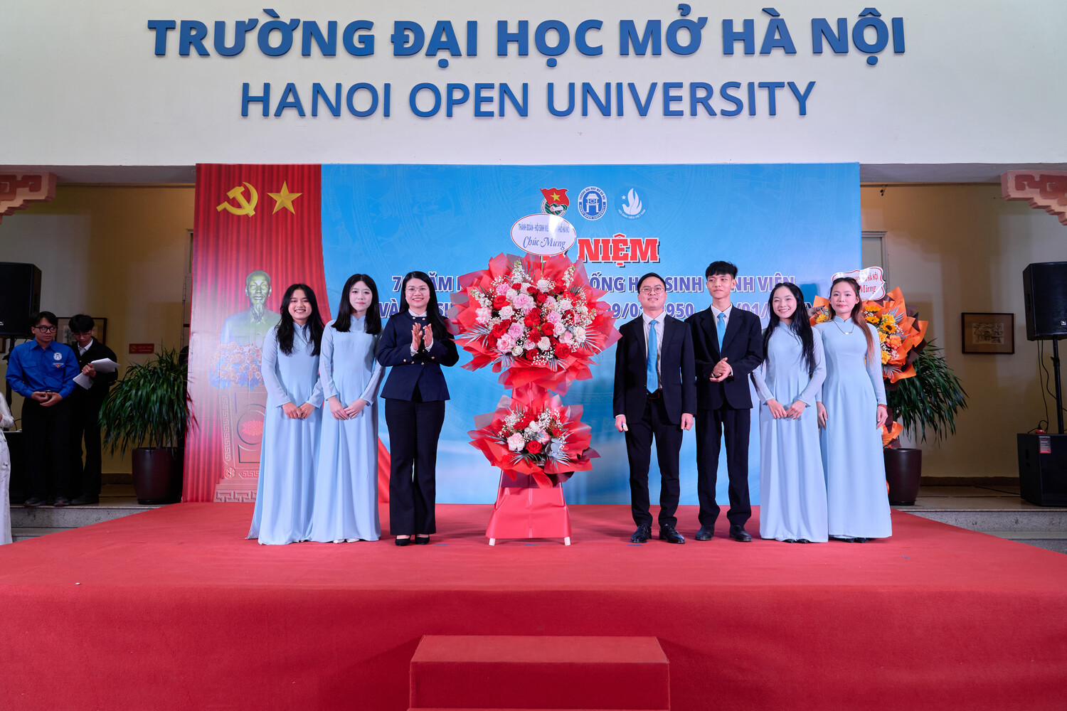 Đ/c Ngô Phú Thảo – Uỷ viên Ban Thường vụ Thành đoàn, Phó Trưởng Ban Công tác Đoàn và Thanh Thiếu nhi Uỷ ban Mặt trận Tổ quốc Việt Nam Thành phố, Phó Chủ tịch Thường trực Hội đồng Đội Thành phố tặng hoa chúc mừng BCH Hội SV Trường Đại học Mở Hà Nội