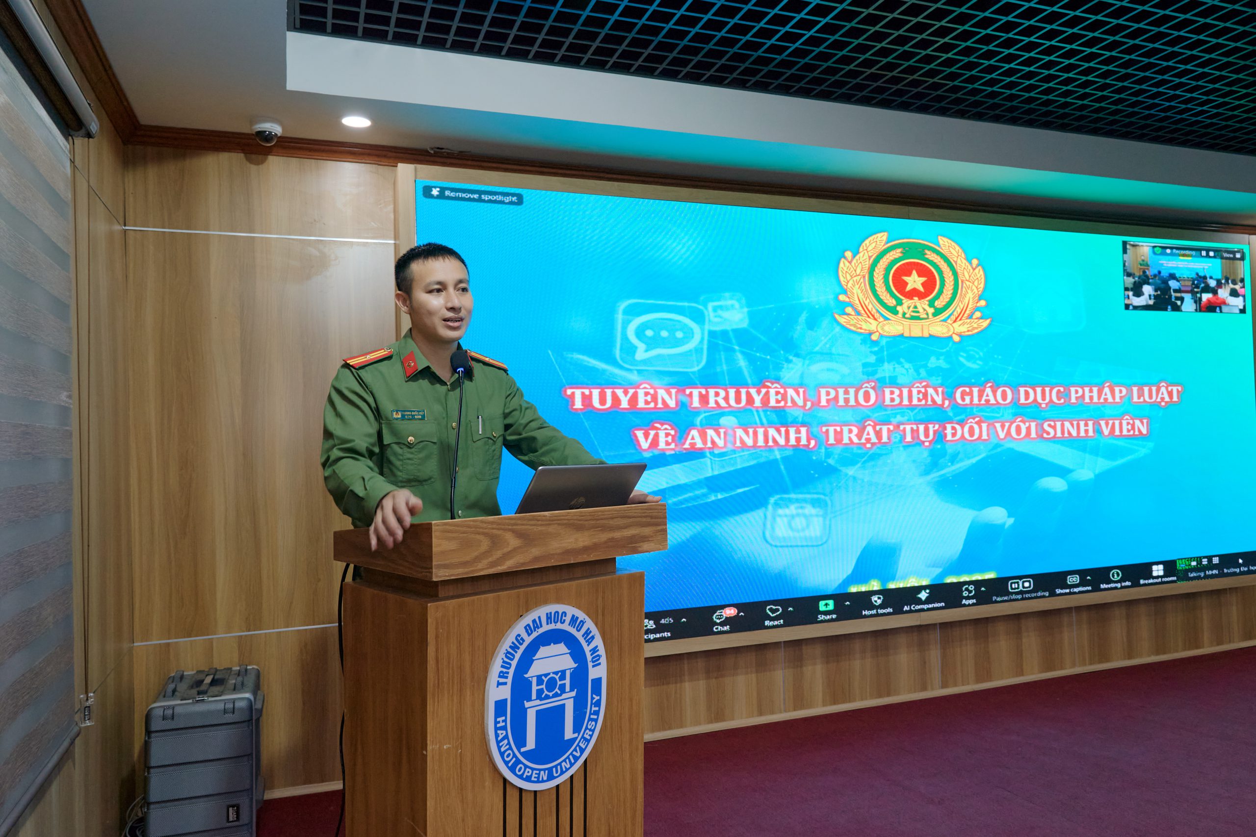 Tại Hội nghị, Thiếu tá Trương Quốc Việt, cán bộ Phòng An ninh Chính trị nội bộ, Công an TP Hà Nội đã trình bày báo cáo về tình hình an ninh chính trị, trật tự an toàn xã hội trên địa bàn Thành phố, đặc biệt là các vấn đề liên quan đến an ninh mạng, tội phạm công nghệ cao và các hành vi vi phạm pháp luật trong môi trường học đường. Báo cáo viên nhấn mạnh vai trò của sinh viên trong việc nâng cao ý thức chấp hành pháp luật, cảnh giác trước các thông tin xấu độc và tích cực tham gia phong trào “Toàn dân bảo vệ an ninh Tổ quốc”.