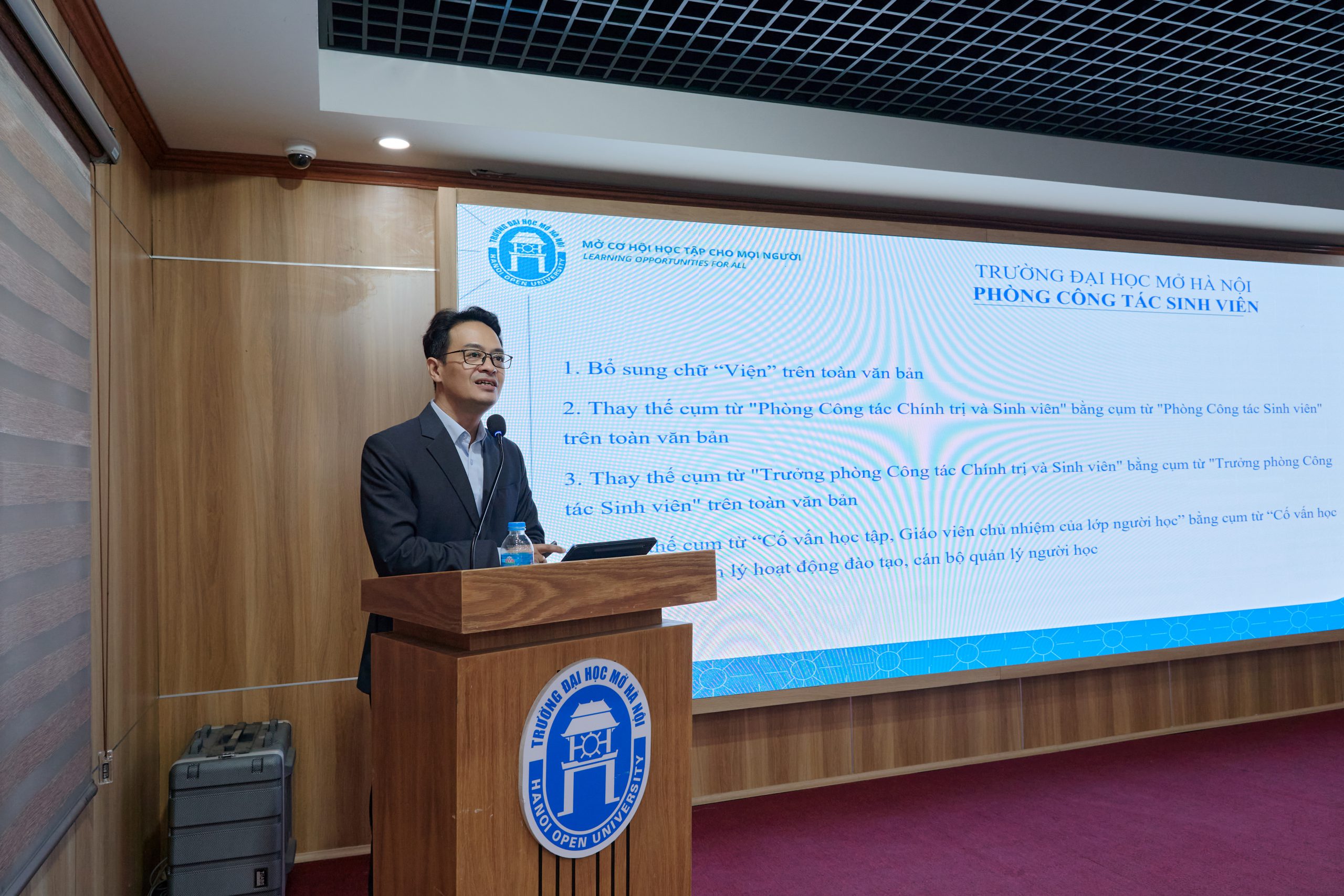 Tiếp đó, ThS. Lương Tuấn Long, Trưởng Phòng Công tác Sinh viên đã phổ biến những nhiệm vụ trọng tâm về công tác sinh viên năm học 2025-2026 và tập huấn những nội dung mới, quan trọng theo Quyết định số 3903/QĐ-ĐHM ngày 05/11/2025 của Hiệu trưởng Trường Đại học Mở Hà Nội về quy định, quy trình công tác sinh viên trong giai đoạn mới.