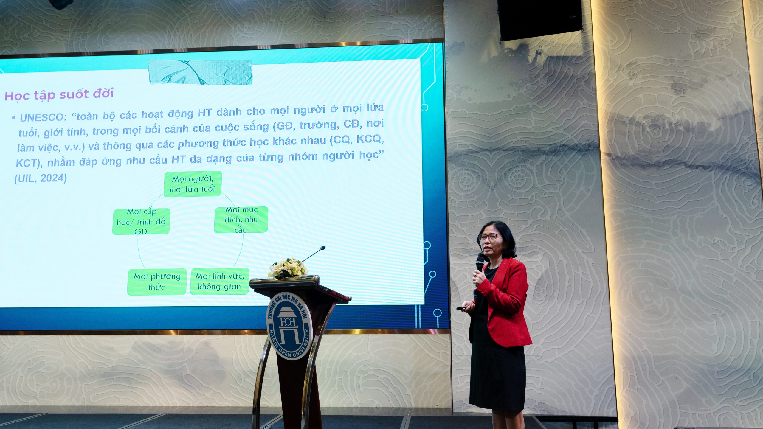 Một góc nhìn chính sách được mang đến bởi ThS. Bùi Thanh Xuân – Phó Giám đốc Trung tâm Nghiên cứu Phát triển Nguồn nhân lực, Viện Khoa học Giáo dục Việt Nam qua tham luận “Đề xuất định hướng chính sách cho việc xây dựng Luật Học tập suốt đời của Việt Nam trong bối cảnh phát triển xã hội học tập số”. ThS. Bùi Thanh Xuân đề xuất cần có hành lang pháp lý rõ ràng để thúc đẩy học tập mở, công nhận tín chỉ lẫn nhau giữa các hình thức học tập và hỗ trợ người dân tiếp cận tri thức số.