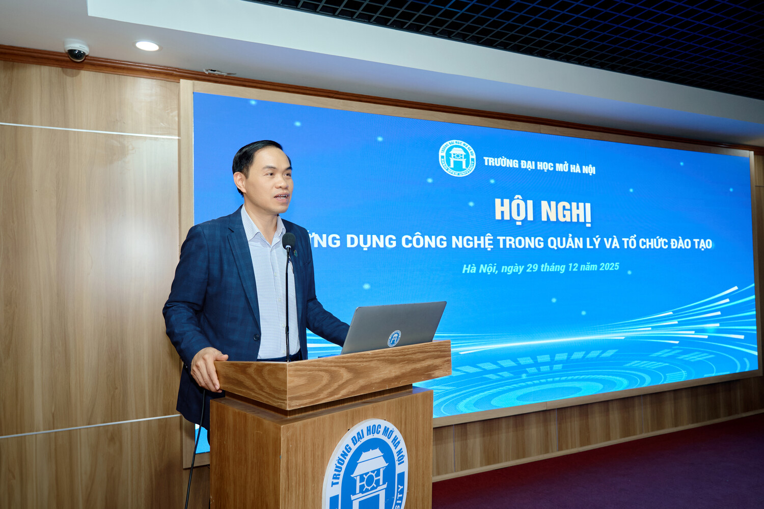 Ngày 29/12/2025, Trường Đại học Mở Hà Nội đã tổ chức Hội nghị “Ứng dụng Công nghệ thông tin trong quản lý và tổ chức đào tạo” với sự tham dự của gần 100 đại biểu gồm đại diện Ban Giám hiệu, lãnh đạo các đơn vị thuộc trường, cán bộ, giảng viên và các khách mời. Hội nghị không chỉ là dịp tổng kết, đánh giá thực trạng ứng dụng công nghệ trong thời gian qua mà còn là diễn đàn khoa học, thực tiễn quan trọng, định hướng chiến lược chuyển đổi số toàn diện trong quản lý và tổ chức đào tạo của Nhà trường giai đoạn mới.