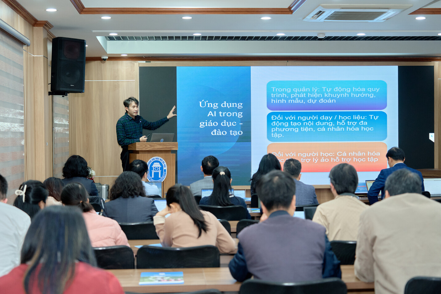 Khép lại chuỗi tham luận chuyên sâu, ThS. Trần Tiến Dũng – Giám đốc Trung tâm Công nghệ Kỹ thuật số đã trình bày định hướng phát triển ứng dụng công nghệ số trong công tác quản lý và tổ chức đào tạo giai đoạn mới. Trọng tâm là xây dựng hạ tầng số đồng bộ, phát triển các nền tảng dùng chung và nâng cao năng lực số cho đội ngũ cán bộ, giảng viên.
