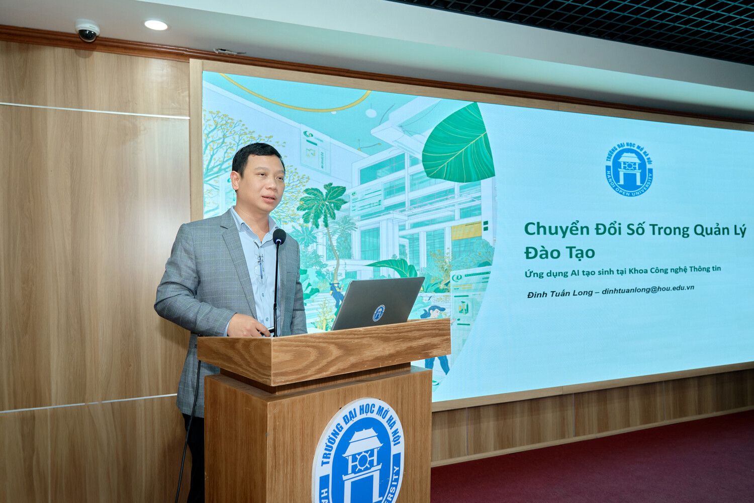 Chia sẻ kinh nghiệm chuyển đổi số trong quản lý đào tạo tại đơn vị mình, TS. Đinh Tuấn Long – Trưởng khoa Công nghệ Thông tin tập trung phân tích việc ứng dụng AI tạo sinh trong hỗ trợ giảng dạy, quản lý học tập và tương tác với sinh viên. Tham luận cho thấy AI tạo sinh không chỉ là công cụ hỗ trợ kỹ thuật, mà đang dần trở thành “trợ lý số” cho giảng viên và cán bộ quản lý, từ xây dựng học liệu, phân tích tiến độ học tập đến hỗ trợ tư vấn học tập cá nhân hóa.