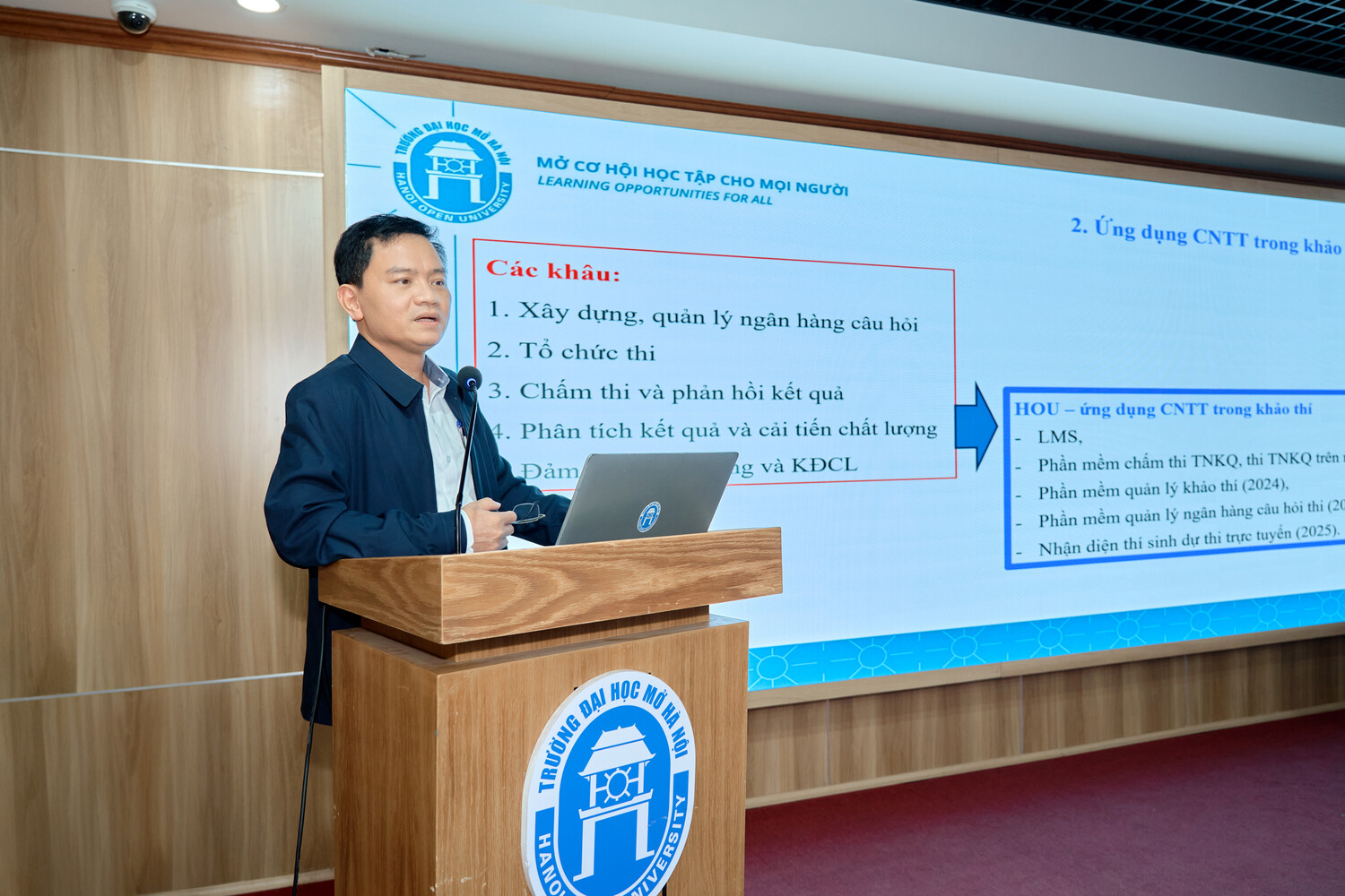 PGS.TS. Mai Văn Lưu – Trưởng phòng Khảo thí và Quản lý Chất lượng đã trình bày tham luận về Ứng dụng CNTT trong hoạt động khảo thí. Báo cáo phân tích rõ thực trạng, những kết quả đạt được cũng như các thách thức trong tổ chức thi, kiểm tra, đánh giá trong bối cảnh đào tạo đa hình thức. Các giải pháp công nghệ được đề xuất tập trung vào tăng cường tính khách quan, bảo mật và chuẩn hóa trong khảo thí, đồng thời đáp ứng yêu cầu kiểm định chất lượng giáo dục.