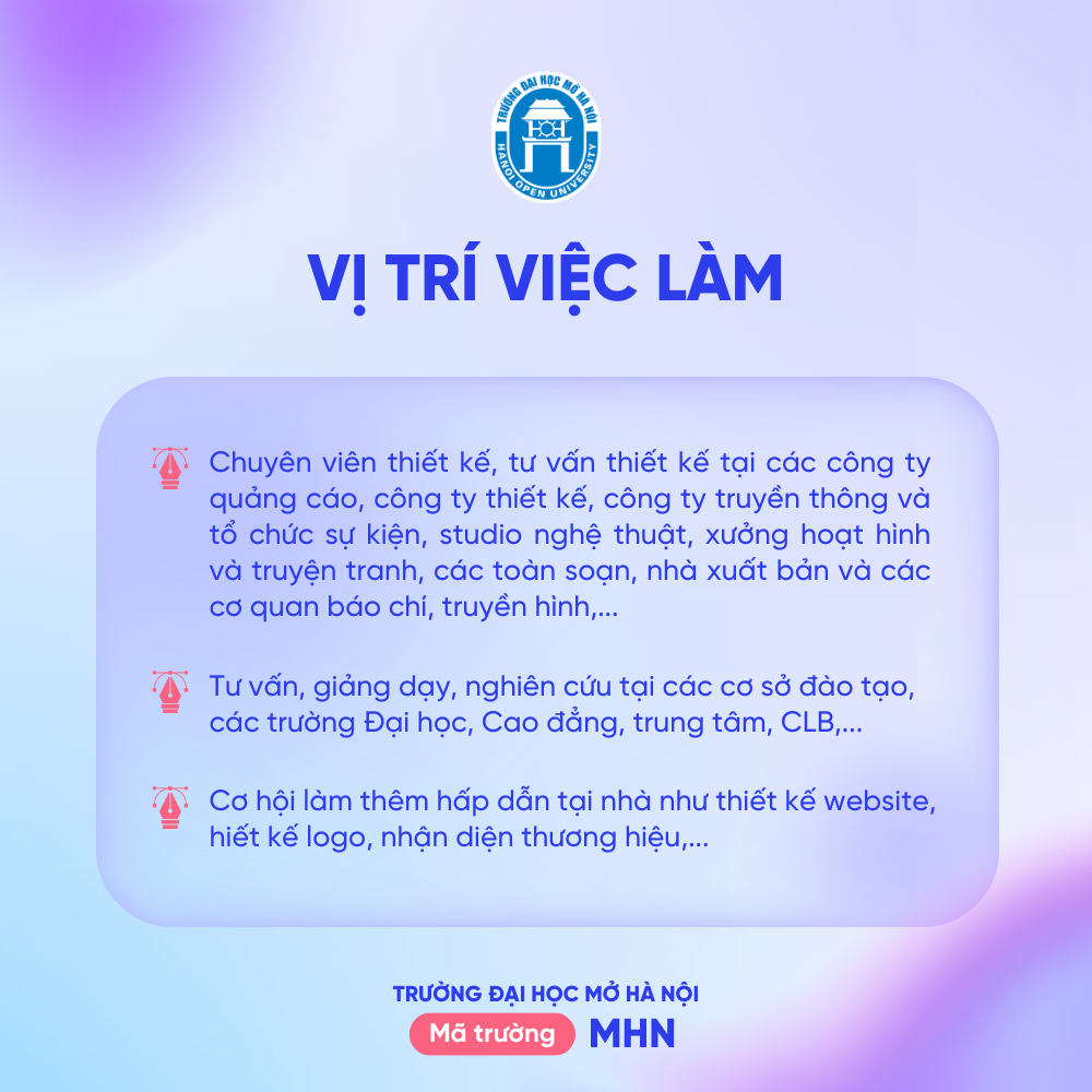 Sinh viên tốt nghiệp ngành Thiết kế đồ họa có cơ hội lựa chọn việc làm phong phú như: chuyên viên thiết kế, tư vấn thiết kế tại các công ty quảng cáo, công ty thiết kế, công ty truyền thông và tổ chức sự kiện, studio nghệ thuật, xưởng phim hoạt hình và truyện tranh, các tòa soạn, các nhà xuất bản, cơ quan truyền hình, báo chí,… Ngoài ra, sau khi tốt nghiệp, sinh viên có thể tự thành lập doanh nghiệp, các công ty thiết kế, dịch vụ studio hoặc tư vấn, giảng dạy và nghiên cứu tại các cơ sở đào tạo, các trường ĐH, CĐ, trung tâm, CLB,… Hơn nữa, như một đặc thù ưu ái, ngành Thiết kế đồ họa luôn mang lại những cơ hội làm thêm hấp dẫn tại nhà như thiết kế website, thiết kế logo, nhận diện thương hiệu,…