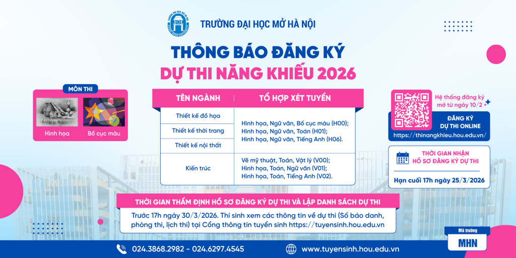 Năm 2026, Trường Đại học Mở Hà Nội tuyển sinh 22 ngành đào tạo đại học chính quy. Trong đó có 4 ngành: Thiết kế đồ họa, Thiết kế nội thất, Thiết kế thời trang, Kiến trúc, khi xét tuyển thí sinh cần phải có điểm năng khiếu vẽ (có thể lấy điểm thi tại các cơ sở giáo dục khác hoặc thi tại Trường Đại học Mở Hà Nội) kết hợp với điểm các môn văn hóa (học bạ hoặc điểm thi tốt nghiệp THPT). Trường Đại học Mở Hà Nội tổ chức Kỳ thi năng khiếu vẽ năm 2026 với các thông tin cụ thể như sau: